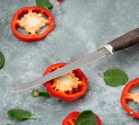 Филейный нож из нержавеющей стали N690, рукоять - стабилизированная карельская береза, кожаный чехол в комплекте.