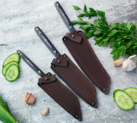 Набор кухонных ножей из стали N690, рукоять - G10, кожаные чехлы идут в комплекте.