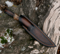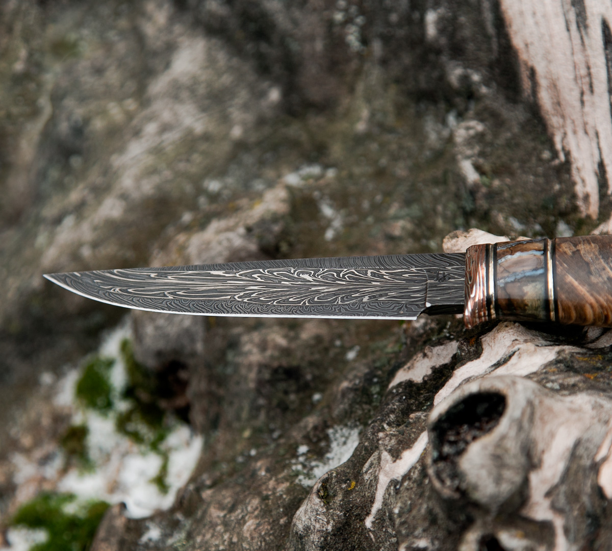 Нож Ладья из мозаичной дамасской стали, рукоять - шпальт, стабилизированный зуб мамонта. Формованный чехол идет в комплекте.