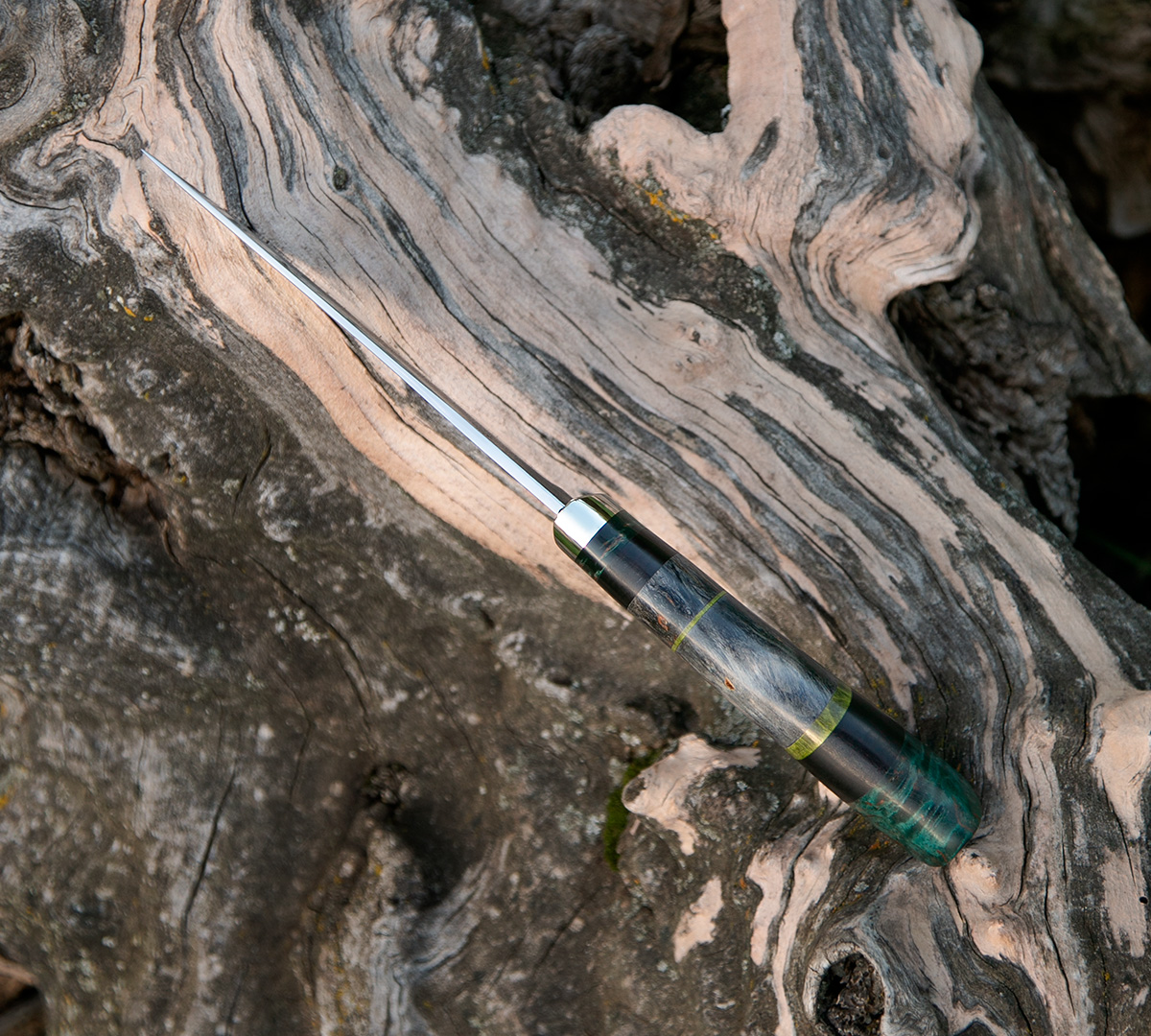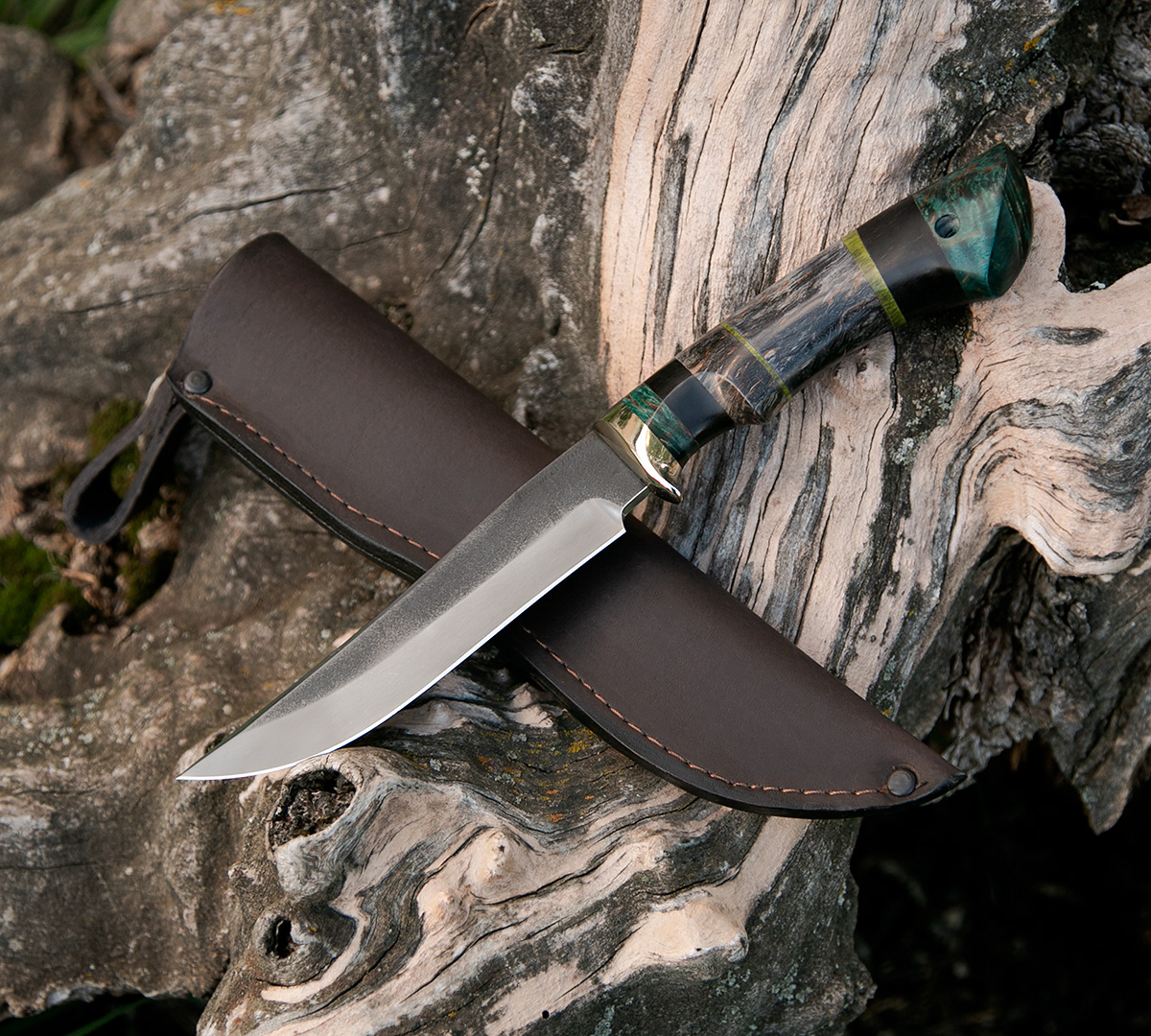 Нож Клыч из кованой нержавеющей стали 110Х18, рукоять - стабилизированная карельская береза, кожаный чехол идет в комплекте.