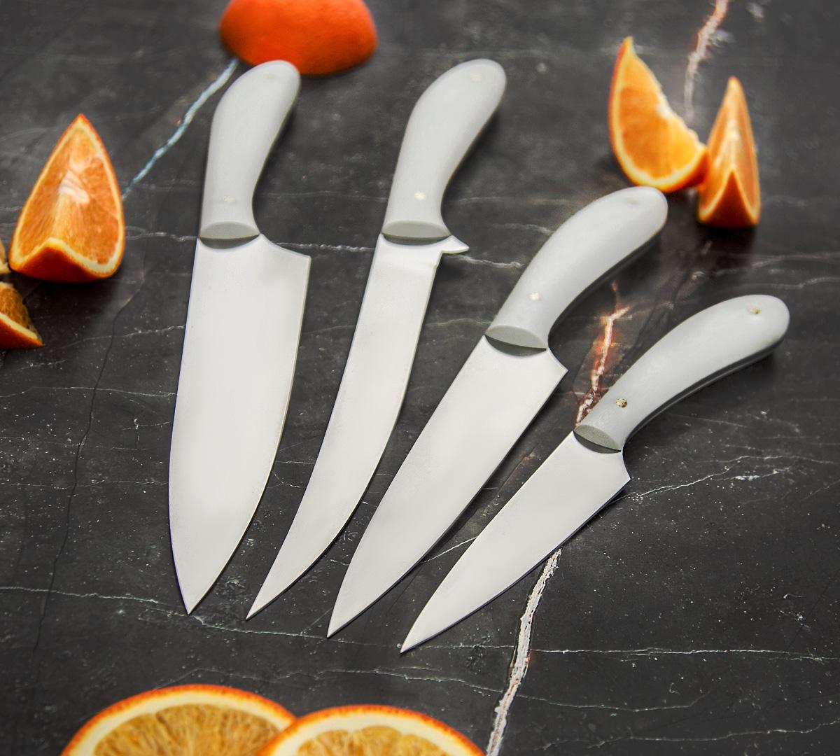 Набор кухонных ножей из нержавеющей стали N690, рукоять - G10, кожаные чехлы идут в кммплекте.