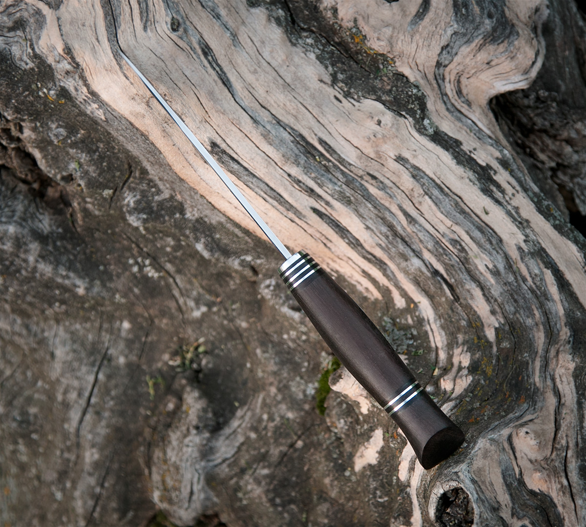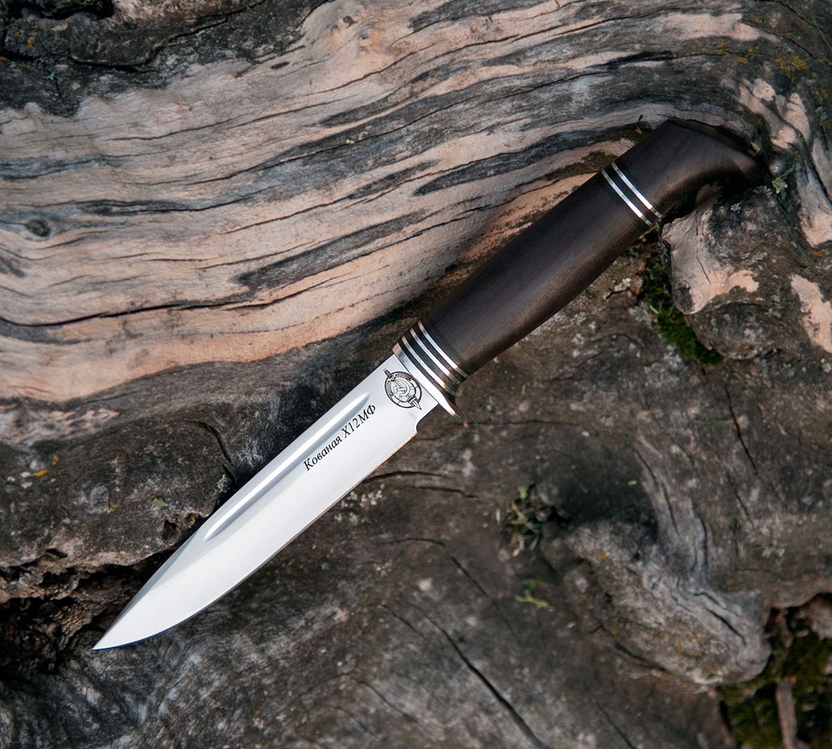 Финка НКВД из кованной стали Х12МФ, рукоять - черный граб, кожаный чехол идет в комплекте.
