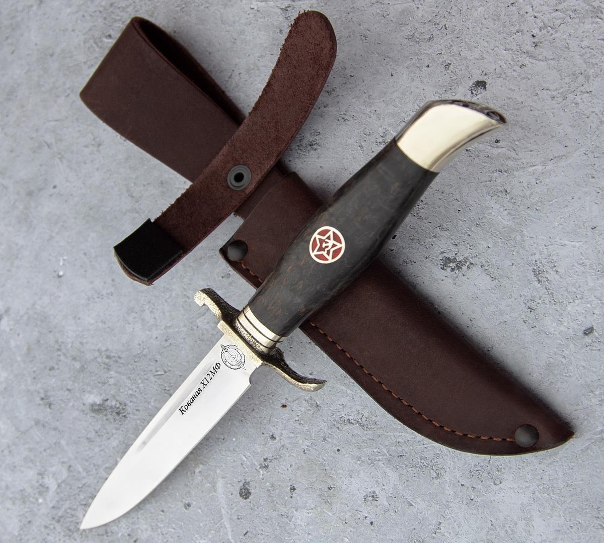 Нож Финка НКВД из кованой стали Х12МФ, рукоять - стабилизированная карельская береза, инкрустация - звезда. Кожаный чехол идет в комплекте.