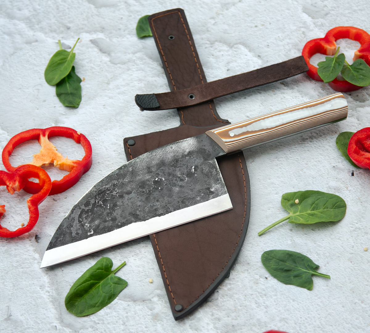 Сербский шеф нож из кованой стали Х12МФ, накладки рукояти - G10, кожаный чехол в комплекте.